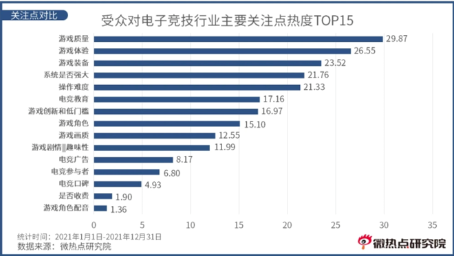 市场持续升温,电竞用户的多样化需求更加明显。最近新浪游戏联合微热点研究院联合推出《2021年中国电竞行业网络关注度分析报告》显示,2021年度,游戏质量成为电竞用户最为关注的要素,其次为游戏体验、游戏装备及系统。游戏操作难度、游戏人物角色、游戏画质、游戏创意等方面也是用户选择游戏时的主要关注点。