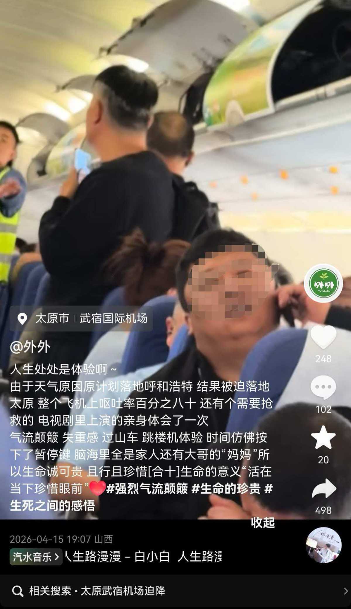 4月15日晚,有乘客发布视频称,由于天气原因,原计划落地呼和浩特,结果被迫落地太原。途中遭遇气流颠簸失重感,像坐过山车、跳楼机的体验,好多乘客都被颠吐了。时间仿佛按下了暂停键,自己脑海里全是家人,机舱内还有人喊“妈妈”。