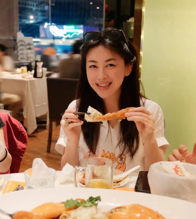 朱珠扎着丸子头,穿着宽松的 T 恤,正对着一盘黑胡椒蟹吃得开心。王昀佳戴着一次性手套,细心地把蟹壳拆开,把剔好的蟹肉放到她的碗里。女儿坐在儿童餐椅上,自己拿着小勺子,吃得满脸都是。